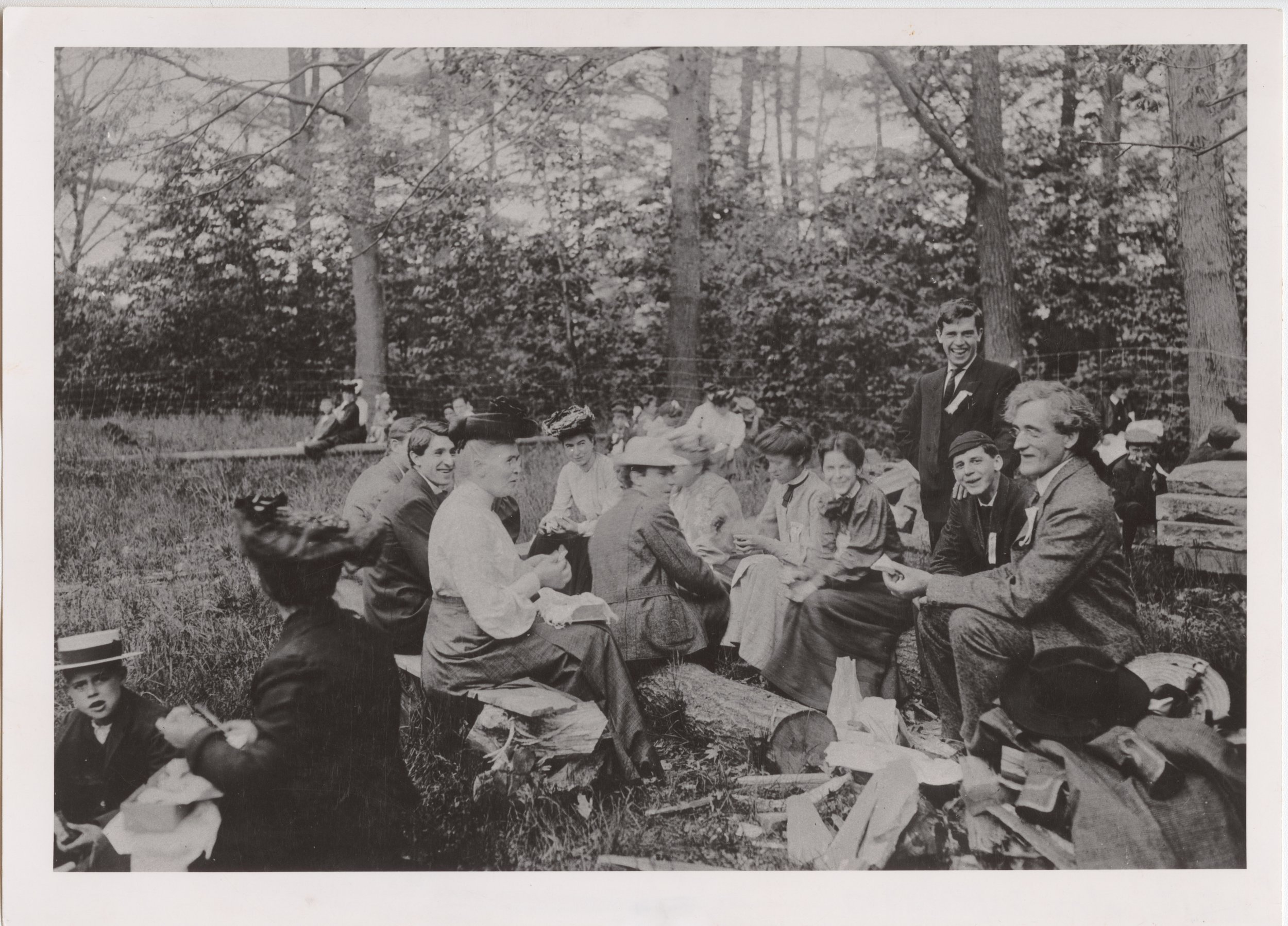 Liberty Hyde Bailey, dean of the New York State College of Agriculture, examines a sandwich at the first Tompkins County School Picnic, May 26, 1905 (with Anna Comstock), photograph, 29 May 1905. Liberty Hyde Bailey Papers, #21-2-3342. Division of Rare and Manuscript Collections, Cornell University Library. Also available online here.