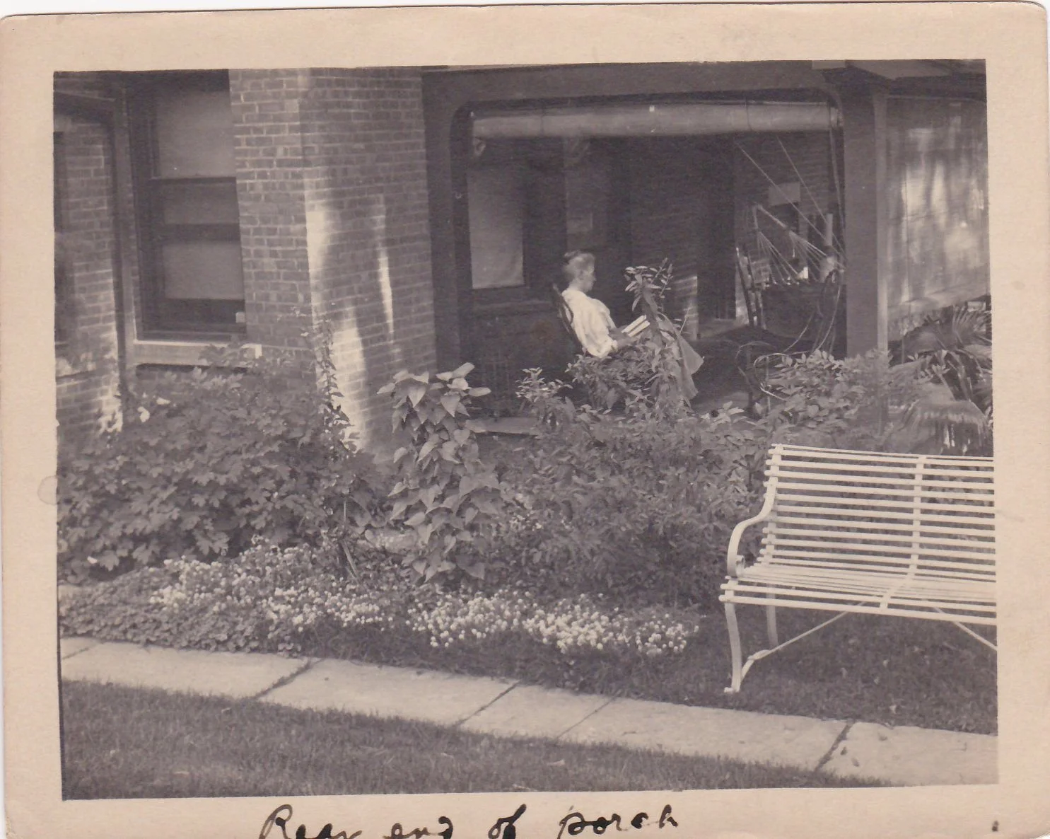 One end of the front porch of the Bailey home, with Liberty Hyde Bailey’s wife, Annette, seated reading. Photograph by Liberty Hyde Bailey, courtesy of the Liberty Hyde Bailey Museum & Gardens, South Haven, Michigan.